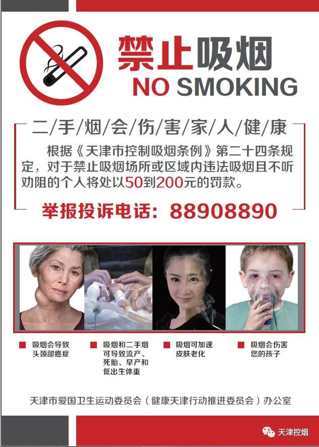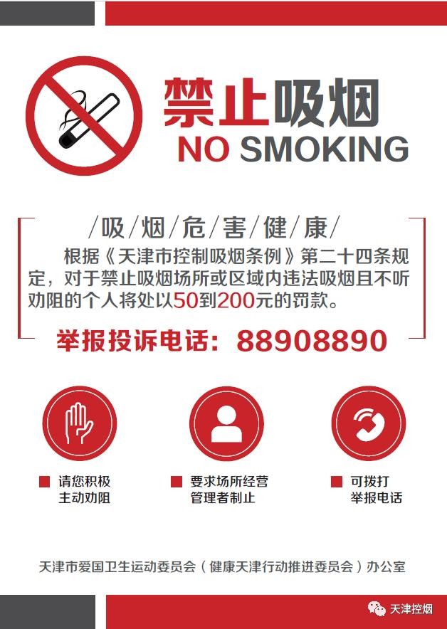 在第33个世界无烟日来临之际,为进一步推动《健康天津行动实施方案(2019-2030年)》控烟目标的实现,强化禁烟标识警示效果,减少公共场所违法吸烟行为,倡导文明健康生活方式,在原有禁烟标识的基础上,天津市爱卫办设计制作了3款升级版禁烟标识,增加了图文信息,更加具有劝阻和警示作用。