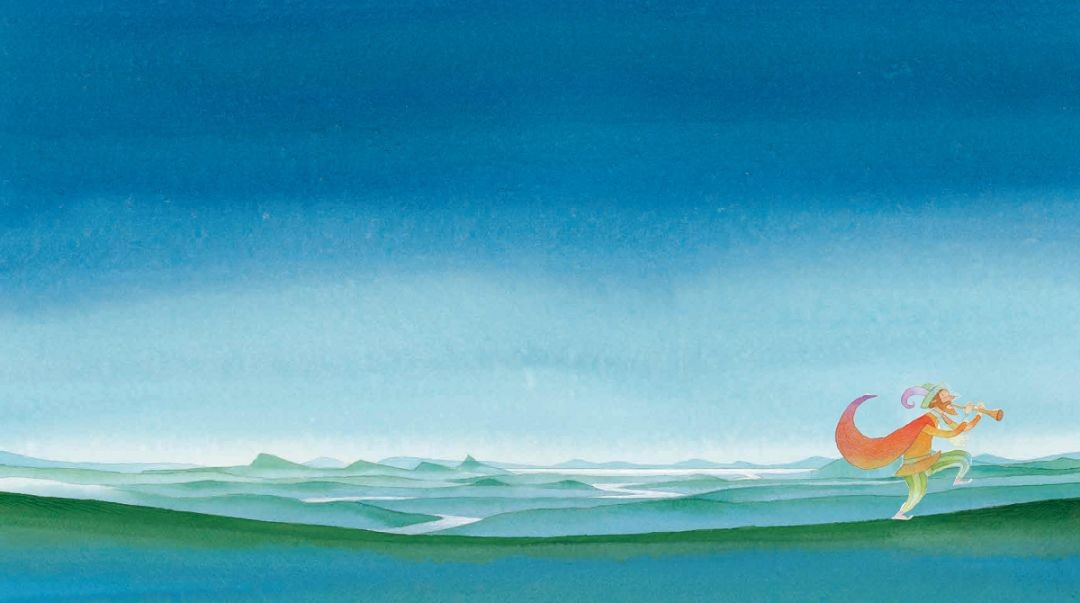 画家直接以钝笔蘸颜料,用极少的笔画、高级的色调画出动物和植物的造型,好一幕辽阔的秋景!