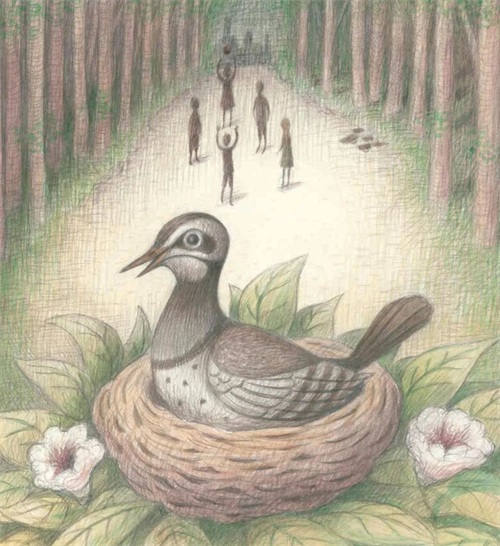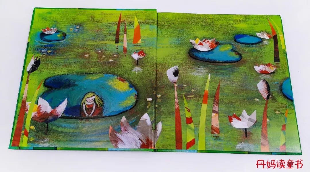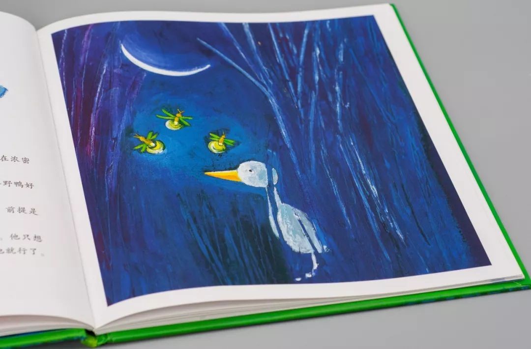 而这本书中,插画没有以正面冲突来表现,而是透过幽暗的月色、星星点点的萤火虫,一只灰突突的尖嘴鸭孤零零的躲在森林里,来向大家展示此时丑小鸭的难过、委屈、危险重重。