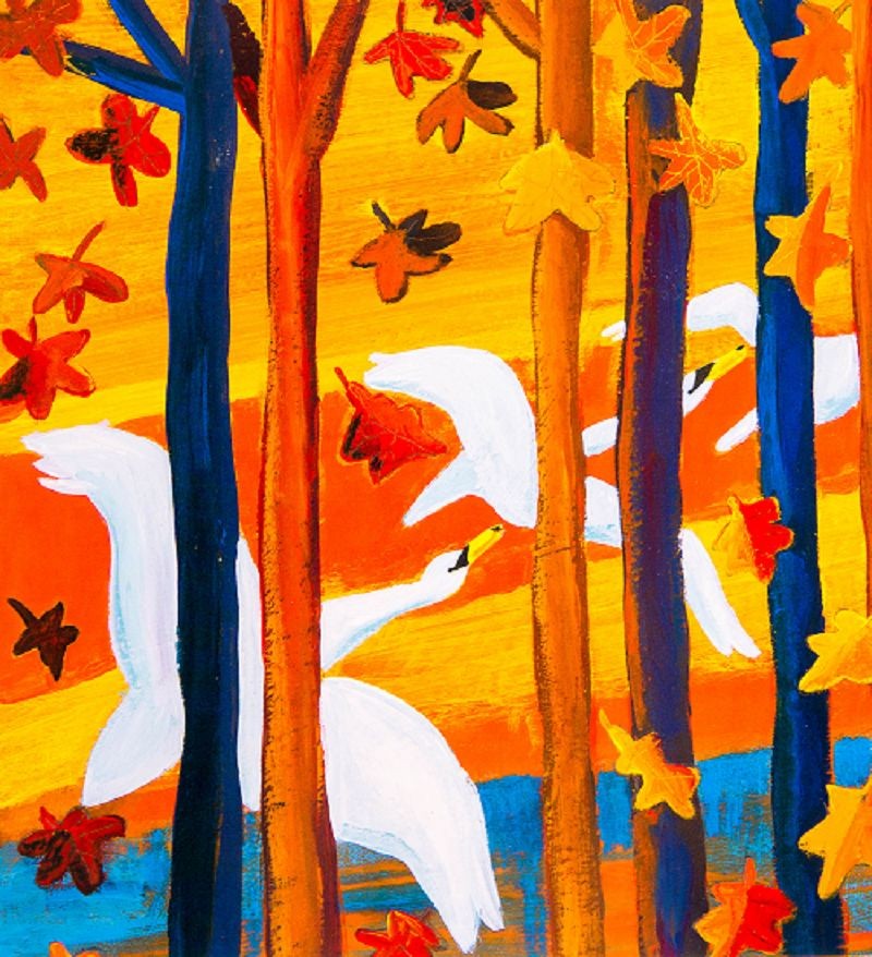 又比如这幅,欣赏下秋天天鹅飞过的场景: