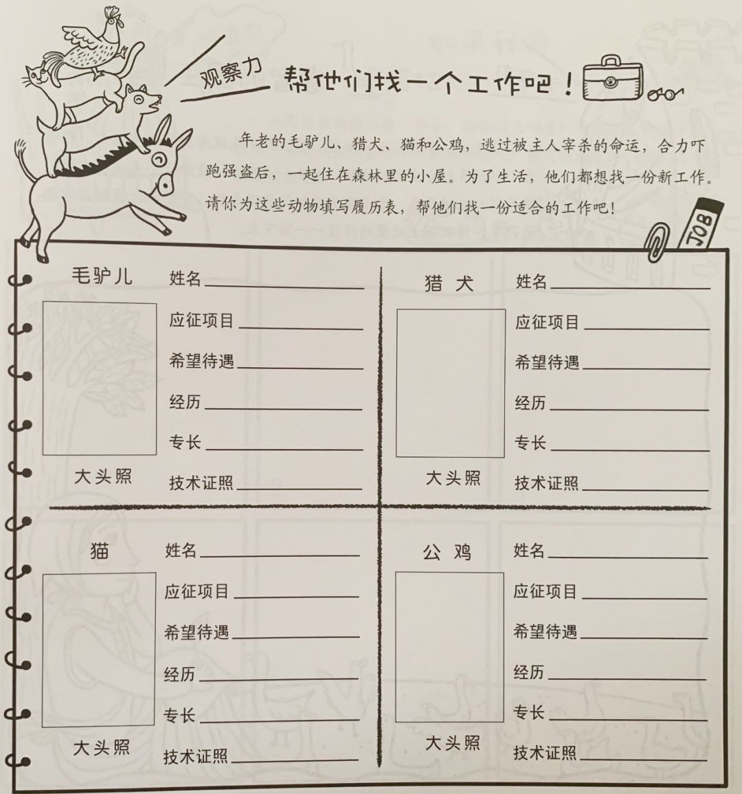 导读手册中,对每一辑的每一个故事,都设计了一个相应的延展学习“互动游戏”。如帮《不来梅的音乐家》们找工作——
