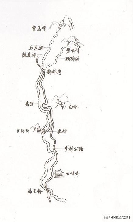 接着他们再去隐真坪。在碧云峰山下,他们询问村民,得到答复说:“你们站的这个地方就是隐真坪,过去这里还有个隐真寺。”隐真寺遗址墙基仍在,一块大石上的“佛”字还很清晰。隐真坪边,有一条小溪名石龙涧,还有一条小溪叫杨柳溪,两条小溪在新桥湾会合后成为禹溪。云峰寺旁有一座康熙年间僧人修的桥,上面“禹溪”二字隐约可见。除此以外,隐真坪附近再没有什么小溪。看来,何致所谓“复渡一二小涧”就是石龙涧和杨柳溪了。