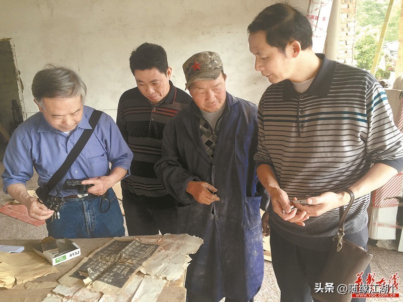 衡山县云峰村石匠王代桃(右二)展示他从石头上拓的字。 李国斌 摄