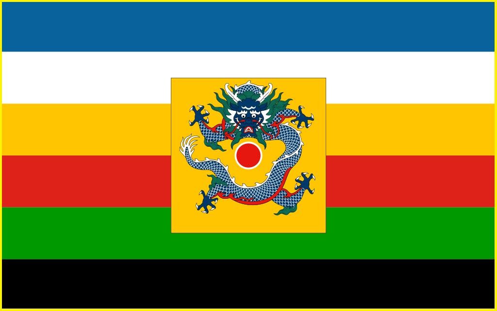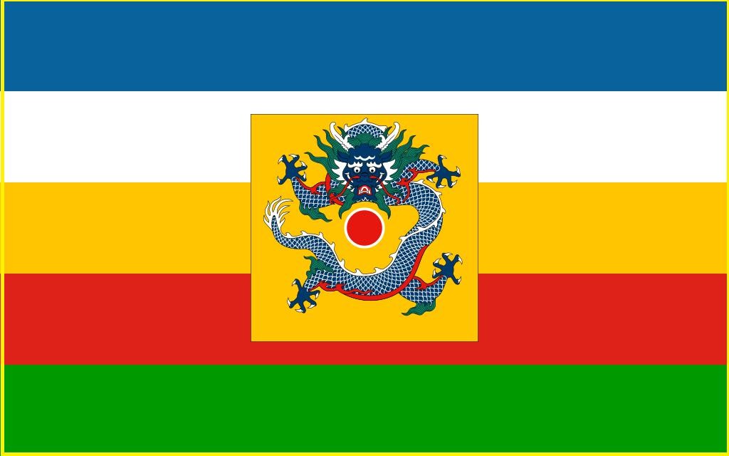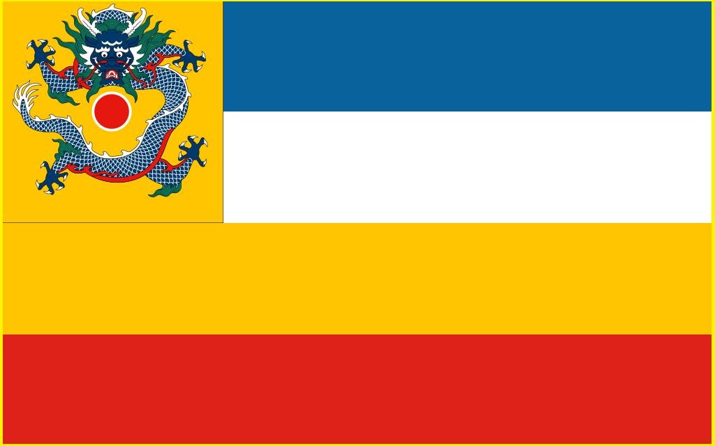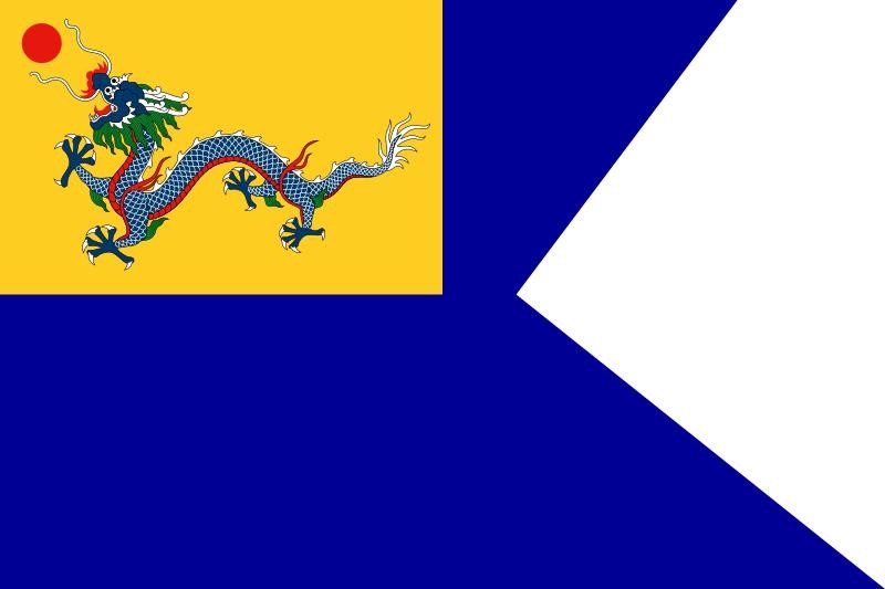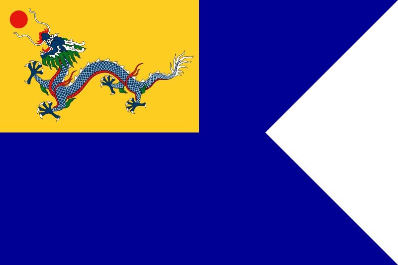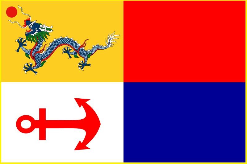 1894年甲午战争后,北洋海军全军覆没,1909年清政府设立海军部,并颁布新衔别旗,左上角为黄龙旗。