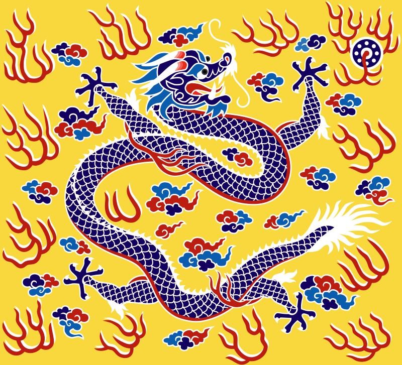 黄龙旗,也称黄底蓝龙戏红珠图。即晚清开始采用的代表大清国的国旗。