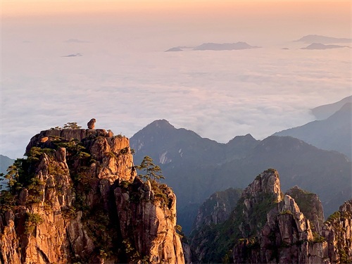 猴子观海,当地居民习惯称为猴子望太平,是黄山著名的奇石景观。位于狮子峰北一座平顶的山峰上,有一巧石,如猴蹲坐,静观云海起伏,人称“猴子观海”。当云雾消散后,石猴又如在远眺太平县境(即今黄山区)的绿野平畴,故亦名“猴子望太平”。其最佳欣赏地点在狮子峰猴子观海观景台。