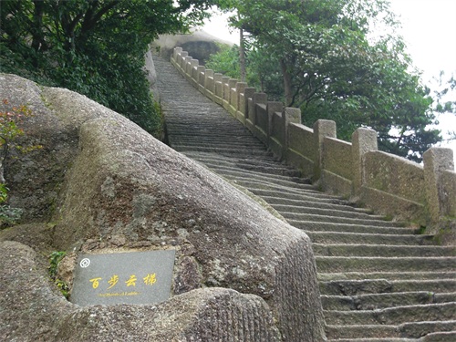 百步云梯。位于莲花峰西北麓的峭壁上。 在“莲梗”不远处有两块巨石,一形如龟,一形如蛇,两石平行。在石壁上凿成的一百余级险峻陡峭的橙道从两石间穿过下行,从对面鳌鱼洞观看,磴道下临深渊,象靠在峭壁上的长梯,常有云雾缭绕,十分险要,这就是“百步云梯”。那龟蛇二石又恰在梯口,如同把守,故名“龟蛇守云梯”