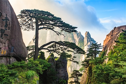 迎客松,屹立在玉屏楼的青狮石旁,处海拔1680米处。树高10.2米,树龄至少已有1300年,是黄山十大名松之首,被列入世界遗产名录。迎客松树干中部伸出长达7.6米的两大侧枝展向前方,恰似一位好客的主人,姿态优美的挥展双臂,欢迎远道而来的客人。迎客松是黄山的标志性景观,承载着拥抱世界的东方礼仪文化。