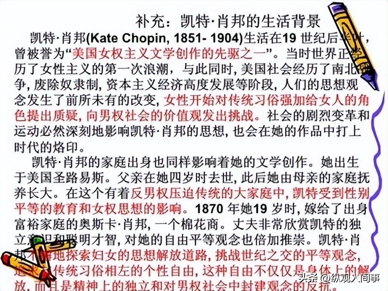 凯特·肖邦对人类的本性和欲望的描述,都是一针见血的。她“不愿用单纯的论断来描述人类阴暗面。”
