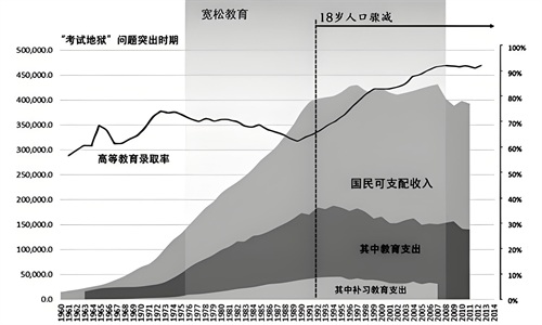 二战后,日本经济迅速复苏,婴儿潮的出现使得教育资源一度紧张,家长们纷纷送孩子上补习班以提升竞争力。但随后的减负政策却导致学生成绩出现滑坡现象。在公立教育逐渐式微的过程中,富裕家庭纷纷转向私立办学机构,私立与公立高中考入东京大学的比例呈现出此消彼长的态势,而私立学校的费用大约是公立学校的3倍左右。