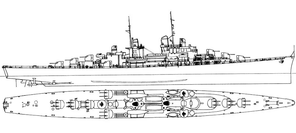 主炮为16门5英寸(127mm)Mk 12型,口径与驱逐舰的相同,但是炮塔超多,从照片上可以看出:舰桥前方和舰尾各有三座双联装炮塔,在舰体后部指挥塔两侧还有两座。防空设置包括三座四联装高炮,两座并列于舰桥左右,第三座在后部指挥塔上方。