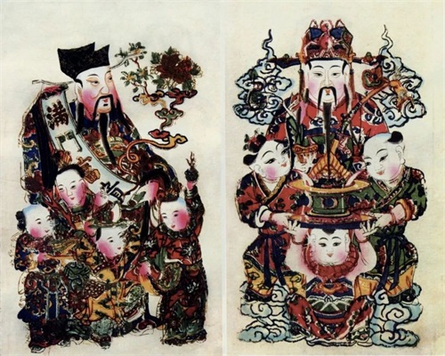 与此同时,门神的功能再度被升华,祈福迎财的使命也安排上了。于是,便涌现出了福、禄、寿三星,以及状元像、送子娘娘、招财童子等等。
