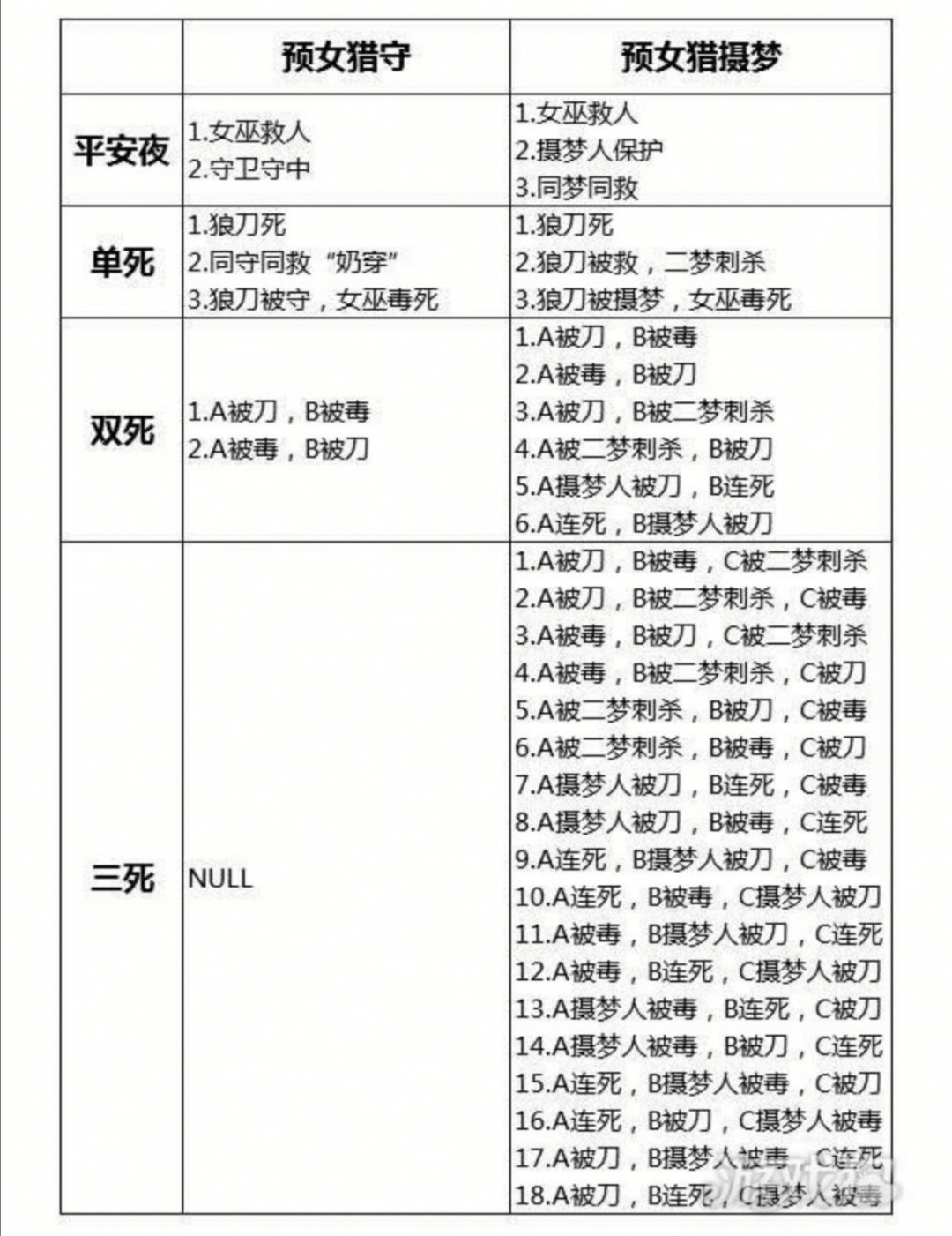 三死,通常会出现在第二夜“女巫撒毒之夜”,总共18种情况,非常复杂。
