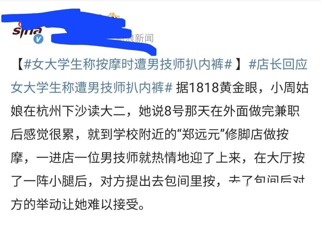 6月21日,杭州女大学生按摩时遭男技师扒内裤的事情冲上热搜。