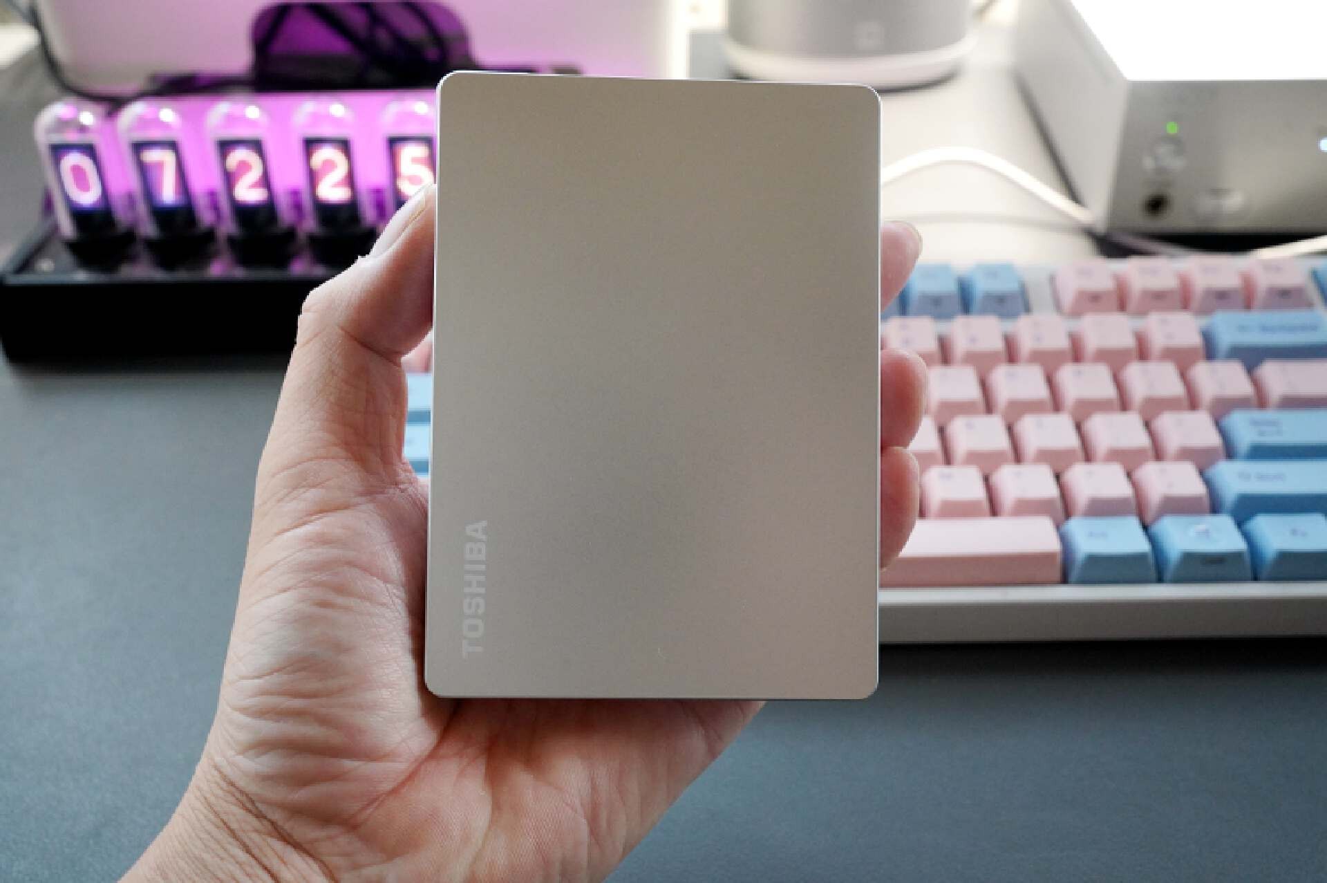 不管是工作还是生活,存点资料、视频、素材还是需要不少存储空间的。对于有共享需求或者电脑扩容需求的小伙伴来说,一个移动硬盘是更佳的选择,这里二狗推荐东芝的Canvio Flex。Canvio Flex采用的是2.5寸机械硬盘结构,正面采用了一体化银色塑料工艺外壳,磨砂工艺处理下质感和触感表现都比较出色。单手可以轻松握持,随身携带还是很方便的。