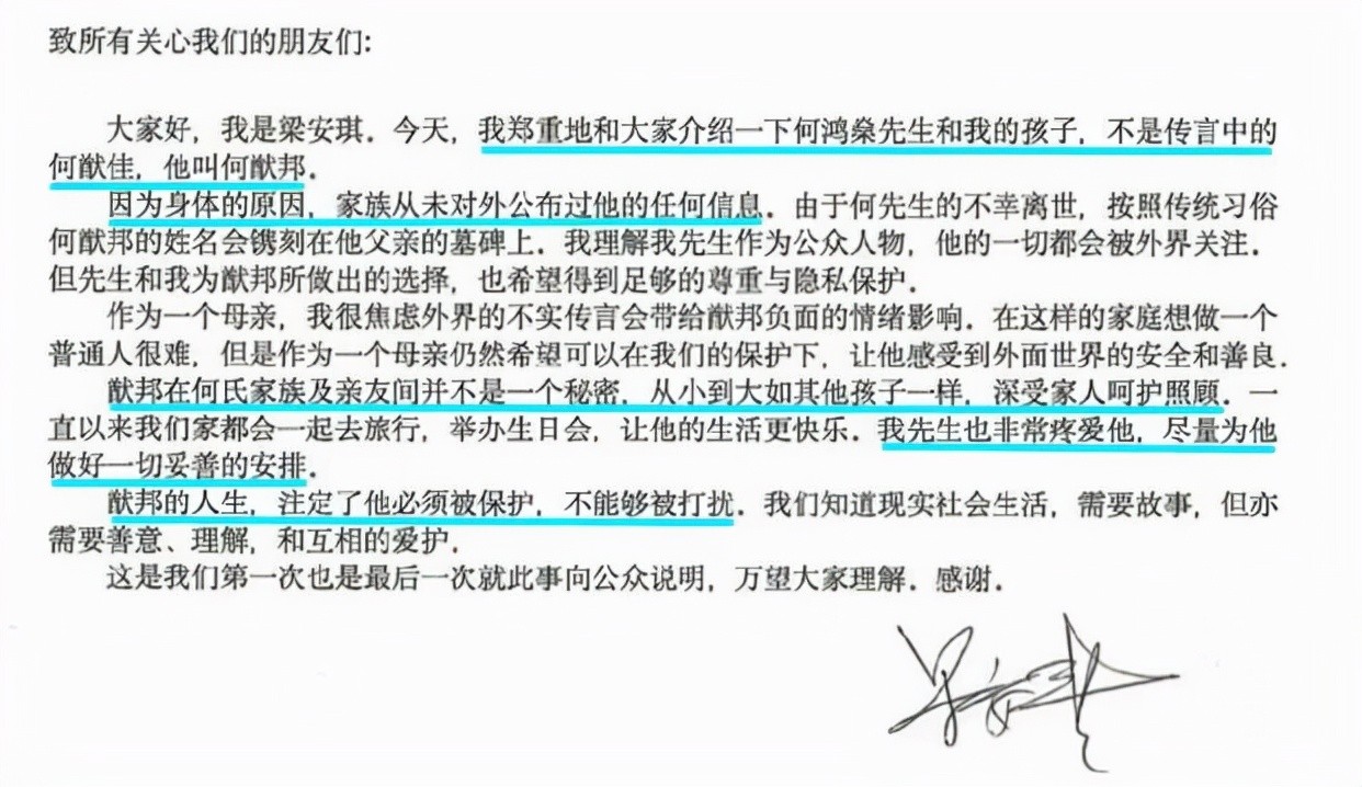 四太梁安琪也出面,对媒体做出说明,这个孩子名为何猷邦,并非网传的何猷佳,一直没有公开,是因为身体的原因,家族希望保护他,让他能够不被外界打扰。