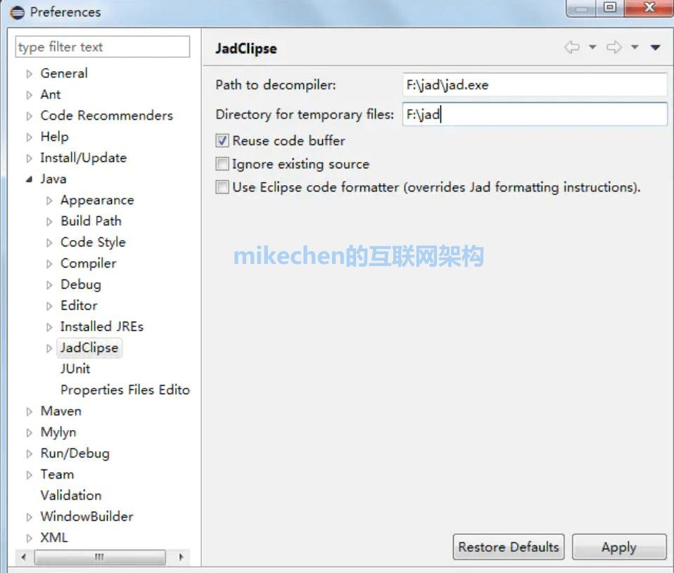 JAD 是一款老牌的、经典的、使用起来简单的 Java 反编译工具,和eclipse的插件JadClipse,二者结合可以方便的在eclipse中查看class文件的源代码。