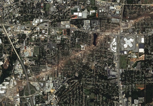 龙卷风路径的卫星图像。