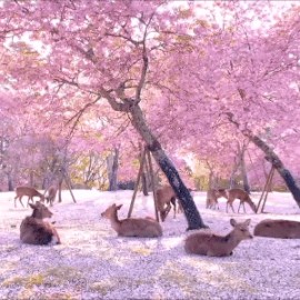 日本奈良,一群鹿在樱花树下放松。