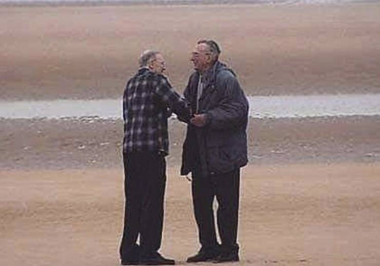 在诺曼底登陆 60 年后的同一个海滩上,大卫席尔瓦(左)与在登陆期间他的敌人海因里希·塞弗洛(右)握手。”