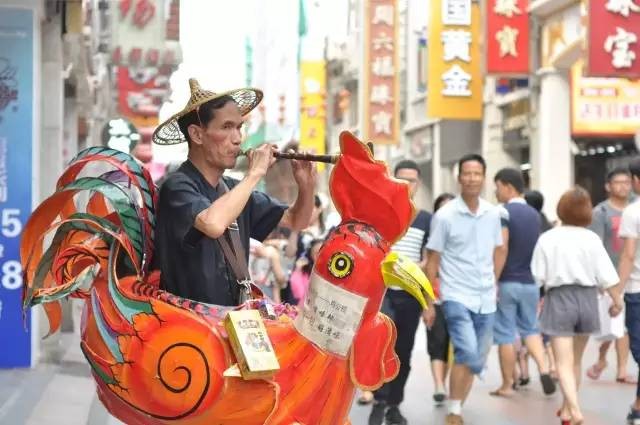 在上下九街头,总有一位伯伯,身上挂着“五彩大鸡公”,头戴斗笠,吹着唢呐在卖鸡公榄,令小荔想起《七十二家房客》中卖鸡公榄的“鸡公福”。