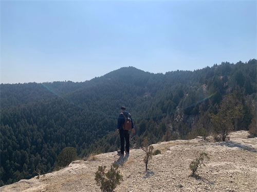 天坑左侧一块大石上画着箭头,写着两个字“黑峪”。我和老王相视一笑,继续,走!这大概是个野路吧,越走越是人烟稀少,人类活动的痕迹,只有小路上的脚印。我们穿过一片长长的柏树林,风在树林间穿行,阳光斑驳地洒在地上,我俩都没有说话,迈动脚步,各自听着自己的心跳和呼吸。穿过柏树林,视野豁然开朗,群山巍峨,连绵不绝。老王轻声说:"登高必自"。是啊,他说的多好。抬头看远方,见天地;低头看脚步,见自己。在翻越了大概4-5个山头后,我们来到了“黑峪顶”。