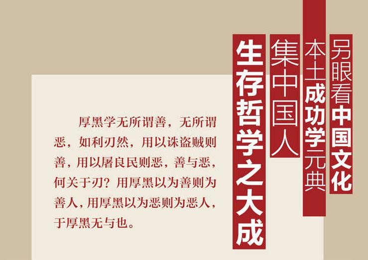 如果大家把李宗吾先生的《厚黑学全集》读完,就会发现作者不过是经过观察研究和反复思索,提出了“厚黑”这种本就存在于世间人性、一直被人所践行、但却从没有人系统论证过的一门学问,以及一系列支撑厚黑学的思想学说,就和儒家学说、法家学说一样,每一种学说都没有正确或错误之分,只是从客观的角度提出了一些思想学说,仅此而已。他作文章的初衷也不是教人如何学坏,而是教人认识厚黑、识别厚黑、不要被厚黑所害、不要被厚黑所限制。