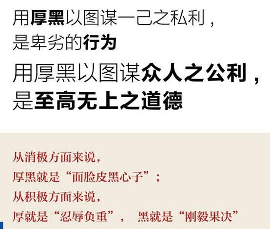 用厚黑以图谋一己之私利,越厚黑,人格越卑污;用厚黑以图谋众人之公利,越厚黑,人格越高尚。