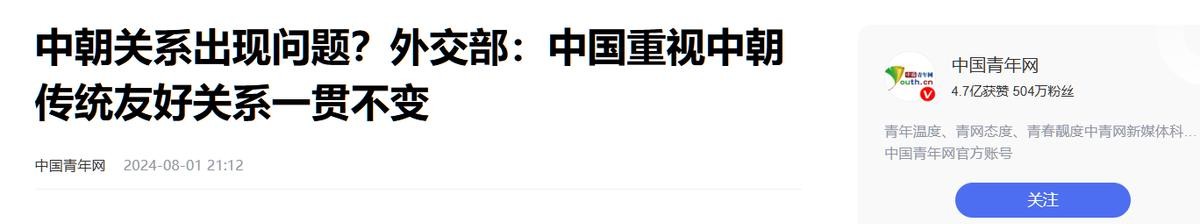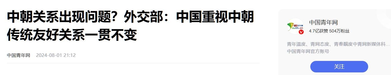 登载于中国青年网2024年08月01日关于中朝关系出现问题?外交部:中国重视中朝传统友好关系一贯不变的报道