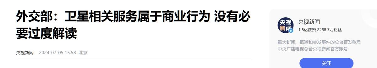 登载于央视新闻2024年07月05日关于外交部:卫星相关服务属于商业行为 没有必要过度解读的报道