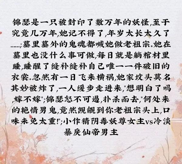 奈何锦瑟真是作精啊,把男主耍得团团转,最后差点酿成大祸,两大佬对决,沈甫亭终不舍伤她,将其封印。四万年后,两人再见,锦瑟一统三界的心不死,终究把沈甫亭惹毛了,开始逼婚。