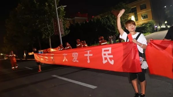 8月27日凌晨,盐城消防官兵抵达灾区后,立刻来到受灾严重的寿光稻田镇进行排涝作业。“我们从千里之外赶来,我们和寿光人在一起,面对洪灾,我们都是寿光人!”一位消防战士擦着汗水接受当地媒体采访时说。