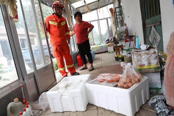 在大棚排涝、村庄清淤间隙,8月30日上午,盐城市消防支队参谋长尹同庆带领消防队员走访看望周边受灾群众。战士们将携带的矿泉水、挂面送给困难村民。走访中,尹同庆了解到到部分村民暂时无法生火做饭,还让后方战勤保障人员紧急加做盒饭,并在第一时间送到灾民手中。