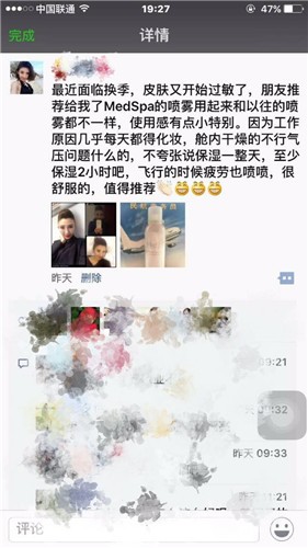 小编看空姐们推荐说化妆前也使用B5喷雾还可以令妆容更服贴,值得一提的是官方说明说“它的高压喷头可喷出69微米小分子,雾化效果非常好,水珠非常均匀,雾珠可以达到肌肤毛孔的1/3的地方,可以迅速退红消肿,若肌肤过敏,喷两三天完全可以治愈。”