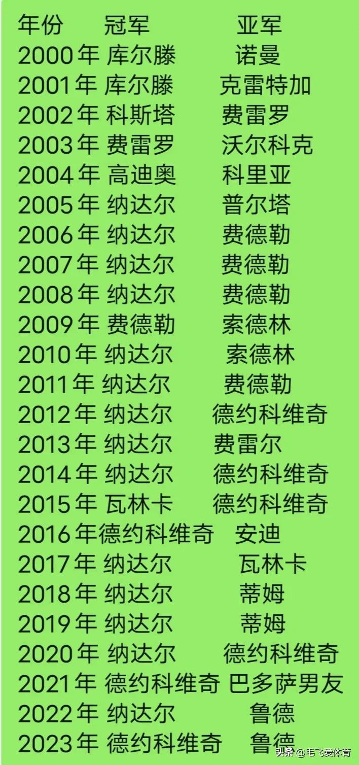 历届法网男单冠亚军