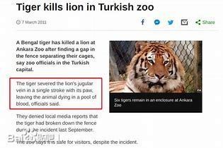 土耳其动物园虎杀狮 “(土耳其首都)安卡拉动物园的一只孟加拉虎在发现隔离(狮、虎)笼子的栏杆上有个缺口后,杀死了狮子。"土耳其首都安卡拉的官员们说。 “老虎用爪子只一击,就划破了狮子的颈静脉,只留下死在血泊里的狮子。”官员们说。 他们否定了上个9月当地媒体所报道的“老虎扭断了栏杆(并把狮子杀死)”的说法。 动物园说,尽管(发生了这样的)事件,游客们还是安全的。