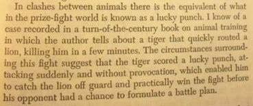 在动物之间的打斗中,有相当于在职业选手(格斗)界被称为幸运一击的事物。我记得在世纪之交的一本关于动物训练的书中记载了一个案例,作者描述了一只老虎迅速地击溃了一头狮子,几分钟后就杀死了他。这场战斗的环境表明,老虎打出了幸运一击,它没有(发起)任何(战前的)挑衅,(而是)突然袭击,这使他能有机会突破狮子的防御,阻止对手赢得实战。