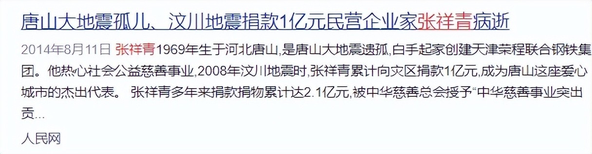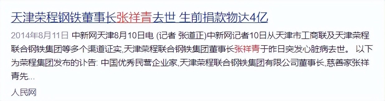 2、天津荣程钢铁董事长张祥青去世 生前捐款物达4亿——人民网2014年08月11日07:18