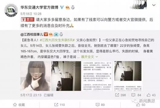 5月18日上午,张绮雯所在高校华东交通大学通过官方微博转发了寻人通知并向社会征求线索。