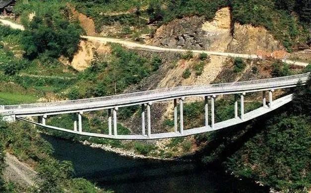 说它不同寻常,是因为它是一座倒挂的桥,桥拱不在桥面上,而在桥面下,学名为“自锚上承式悬带桥”,顾名思义,桥的受重力不在桥拱上,而在桥面两端侵入岩石的锚碇,桥面作为平衡拱的水平力,起着悬带的拉力作用,T型竖桩和锅底式下拱则分担了桥面横跨的抗压力。初看此桥,以为施工人员将图纸拿反了,实际上,上拱改成下拱是一种创新,水平推力转换成水平压力,大桥呈现了倒拱的美学效果。