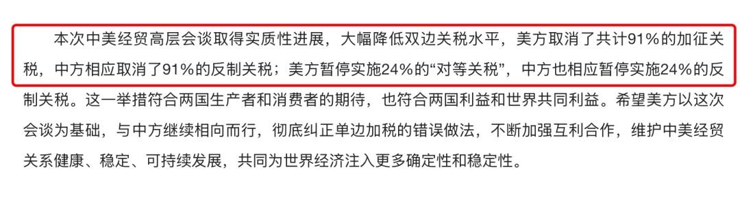 这次联合声明里面,取消了91%的部分,34%的对等关税分两部分,10%保留,24%暂停90天,也就是保留的是30%。这个税率远低于会谈前特朗普说的80%,也低于路透社爆料的54%的水平,实打实的超预期。