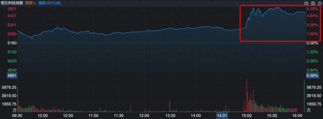 以恒生科技为例,虽然开盘就开始涨,但是涨幅一直维持在2%~3%,3点联合声明发布后直线拉升,收涨5.16%。