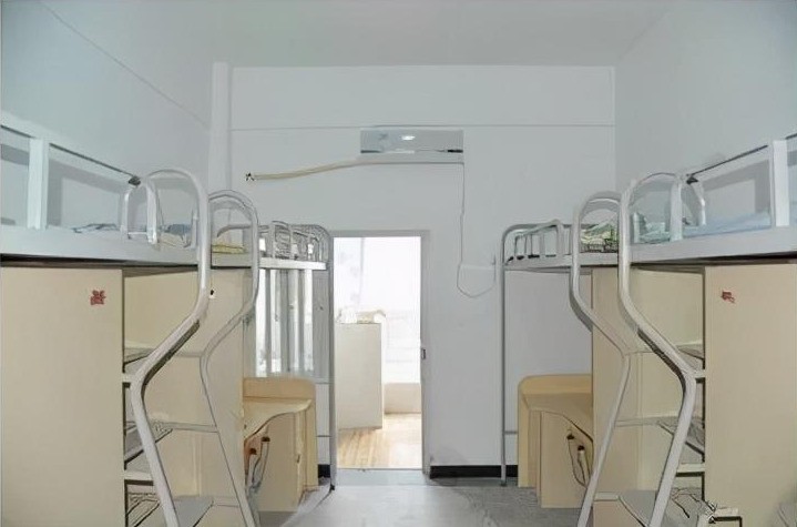 男女分寝室,八人间,总共七楼,每个寝室分上下铺;两个桌子,有大柜子,每个人一个格子;四楼和一楼有热水接,也可以放在一楼,老师会帮忙接;没法洗澡,不过可以自己洗头;有空调,插头是三角的。