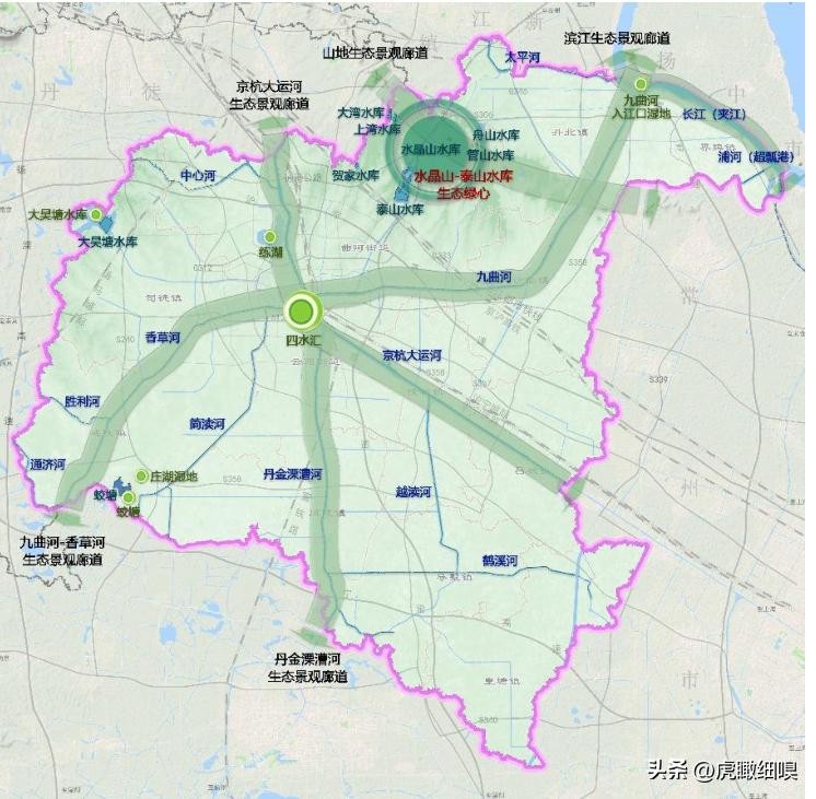 五廊:骨架生态空间整体保护。守基底、 强连通。山地生态景观廊道、滨江生态景观廊道、京杭大运河生态景观廊道、九曲河-香草河生态景观廊道、丹金溧漕河生态景观廊道。