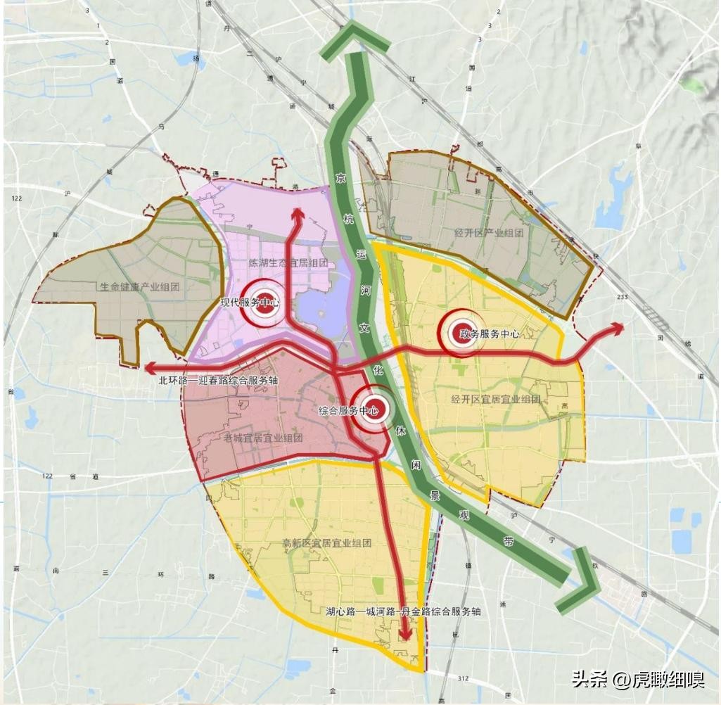 六组团:生命健康产业组团、 练湖生态宜居组团、老城宜居宜业组团、 高新区宜居宜业组团、经开区宜居宜业组团、 经开区产业组团。