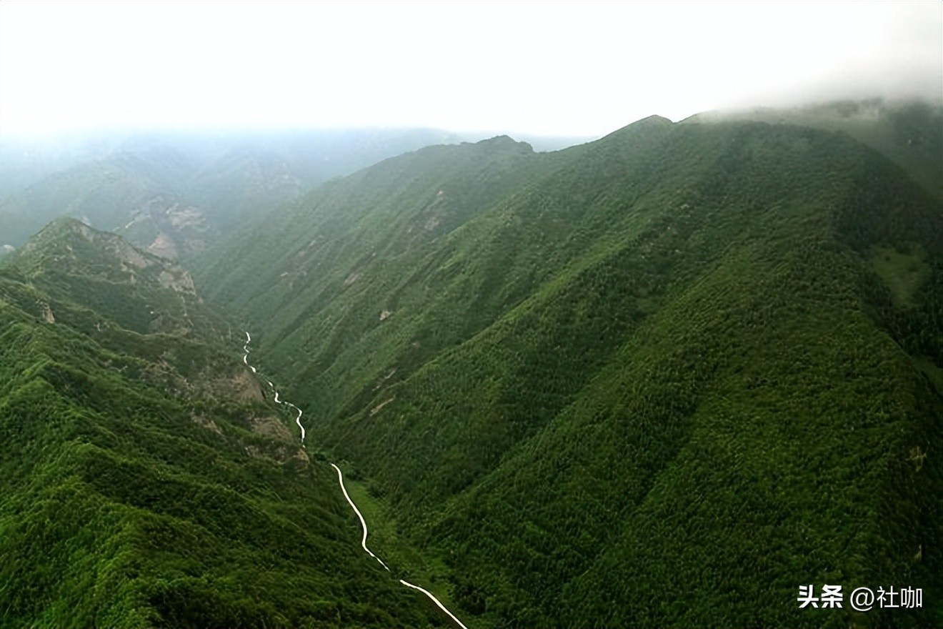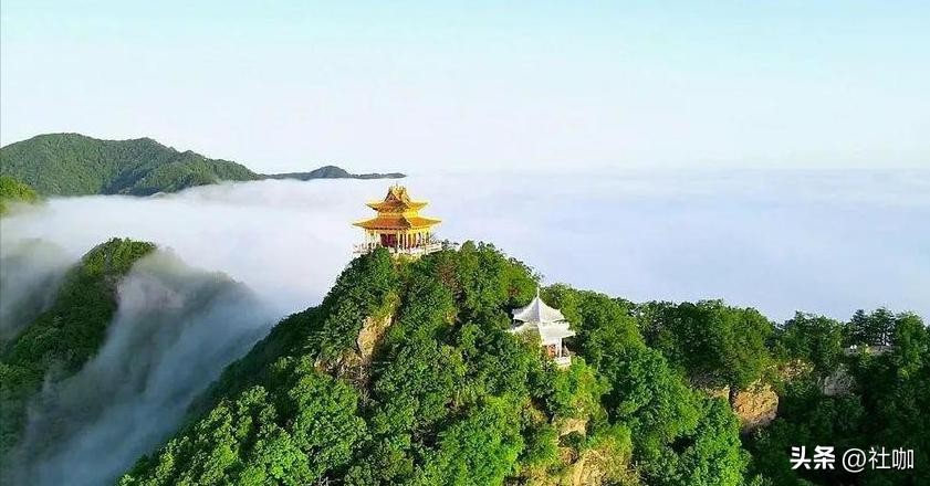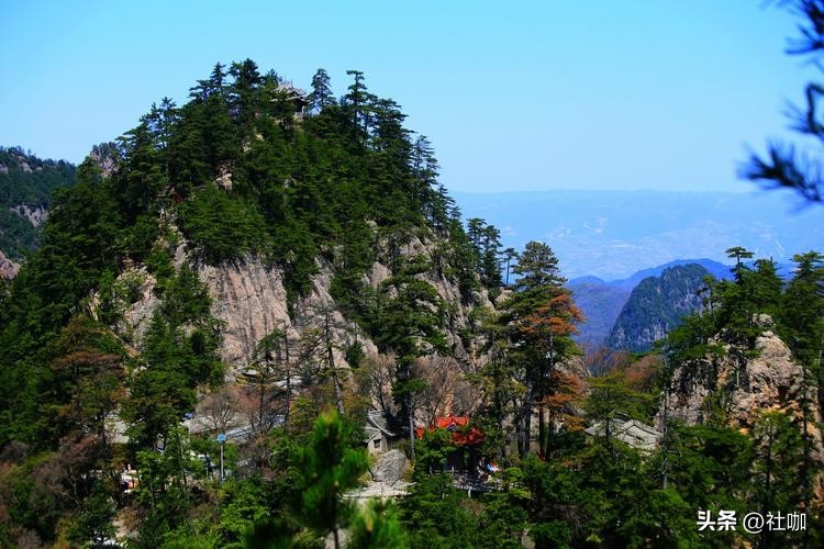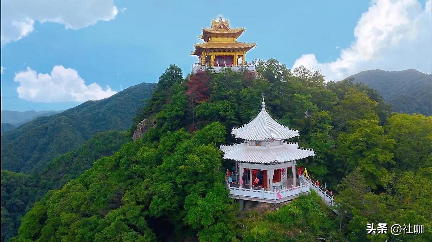 其主峰下方为一呈马鞍状延展的山脊,山脊上有一条窄窄的石子路通往山巅寺宇。站在山巅远眺,远处山峦叠翠,近处沟谷幽深,谷底村庄隐约可见,四周美景尽收眼底。