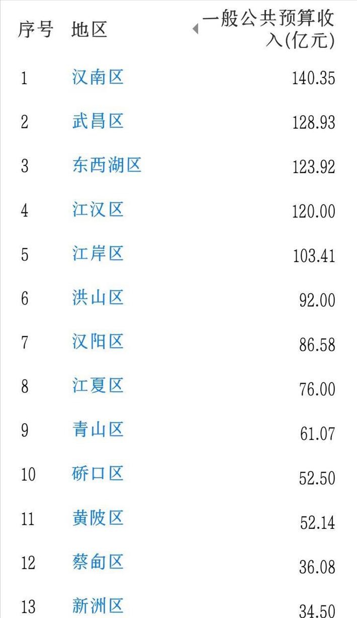 2022年武汉市各区一般公共预算收入