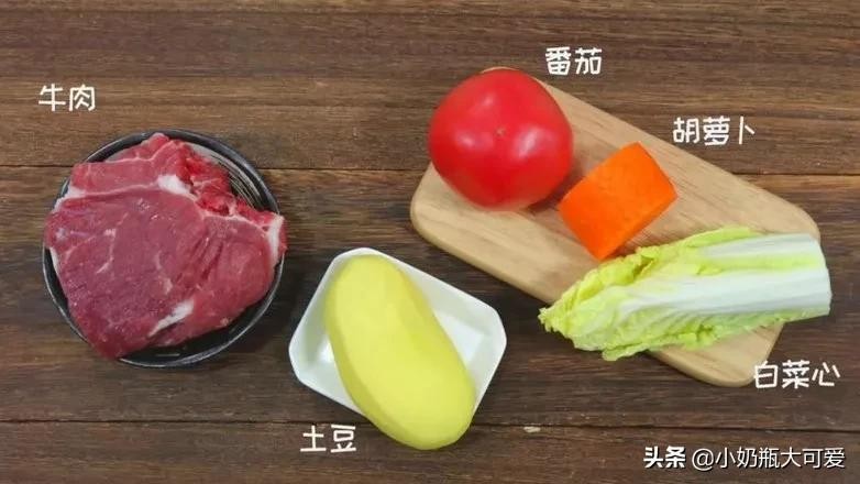 食材:牛肉150克、白菜心40克、胡萝卜30克、土豆1个、番茄1个
