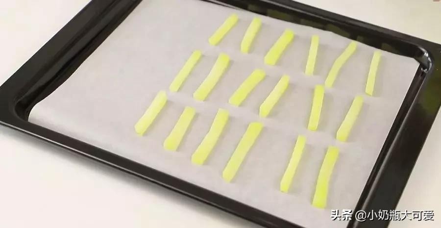 8. 预热这段时间内,我们在烤盘上把土豆条铺在硅油纸上面。