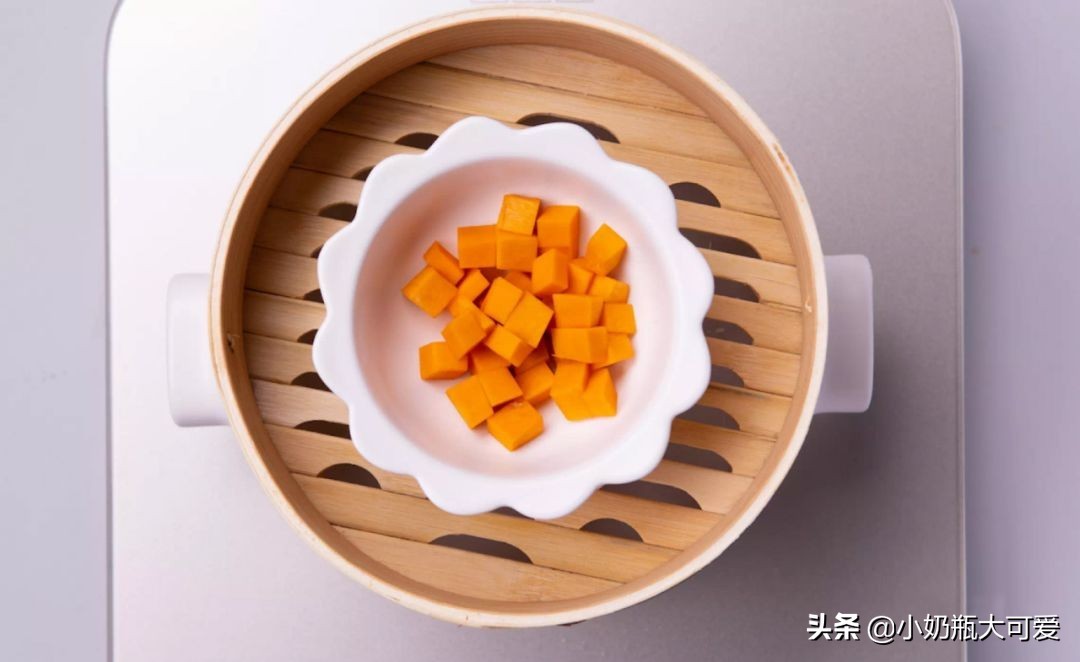 2、南瓜去皮切丁,蒸10分钟,捣成南瓜泥待用。